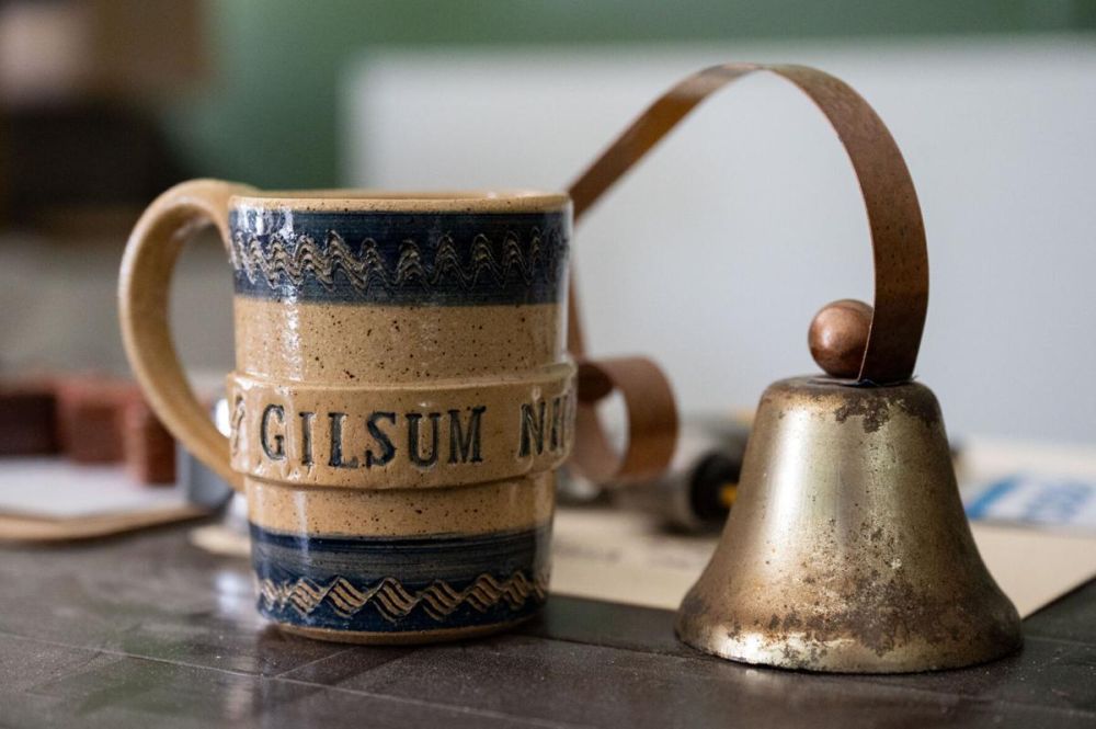 A sample mug from Old Settlers Pottery in Alstead and the store’s original bell sit on a counter on Thursday at the Gilsum Village Store. “We didn’t plan on this, but a lot of our local artisans and growers and vendors are women-owned companies, and it’s just attracting that vibe,” Graham said. “And we love that. We’re going with it.” (Bailey Stover/Sentinel Staff)
