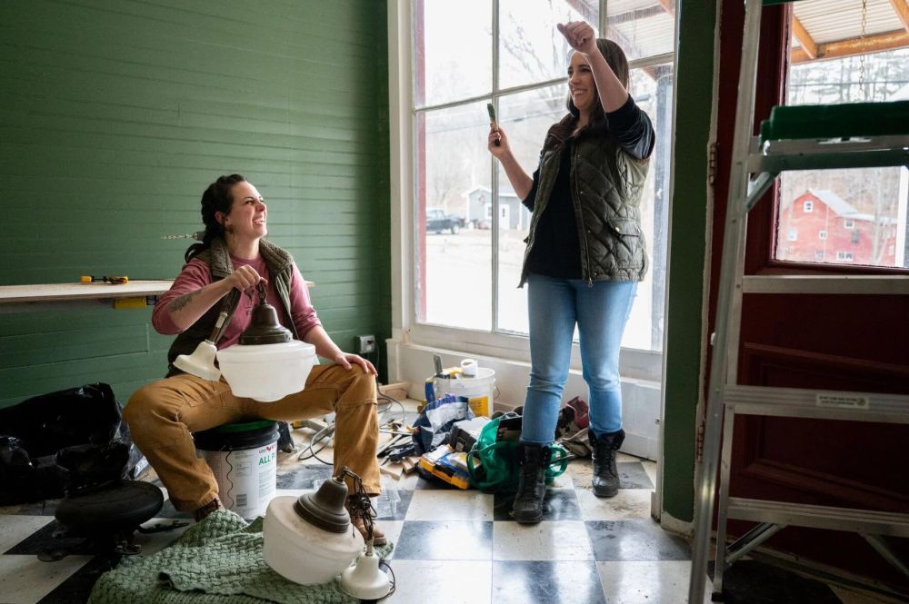 Sisters and co-owners Damaris Graham, left, and Mariana Gibaldi, right, discuss lighting on Thursday at the Gilsum Village Store. “Now that the paint is going on the walls, it’s feeling like go time. It’s happening,” Graham said. “We’re only weeks away, so it’s really coming together now.” (Bailey Stover/Sentinel Staff)