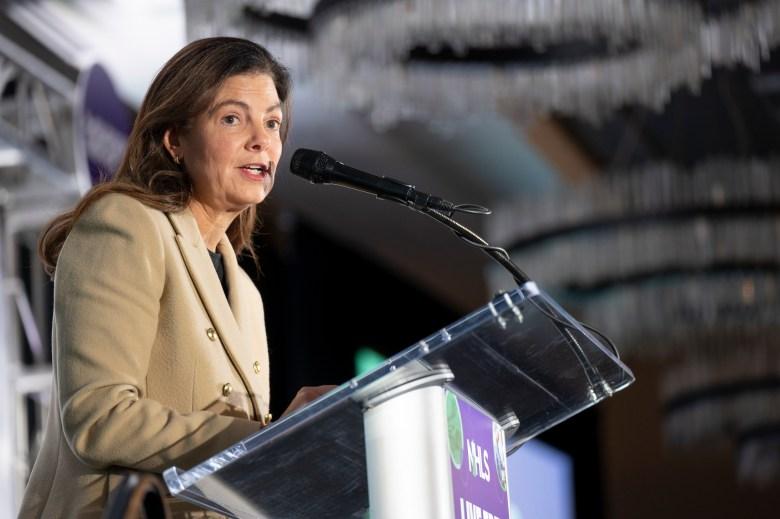NHLS President and CEO Andrea Hechavarria speaks during the NHLS Live Free Life Science 2025 event, at The Artisan at Tuscan Village, in Salem, N.H., on Nov. 12, 2025. (Credit: Daniel Sarch / Granite State News Collaborative)