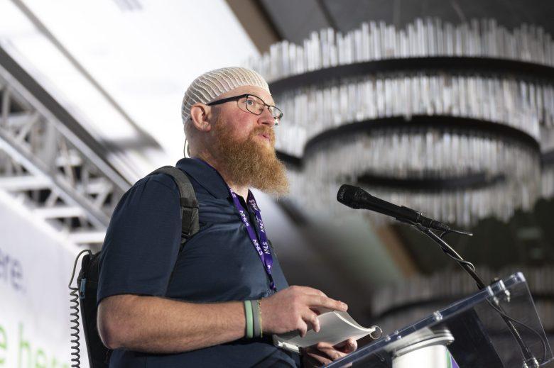 Taylor Gray wears Novocure’s Optune Gio while recounting his experience during the treatment of his glioblastoma during the NHLS Live Free Life Science 2025 event, at The Artisan at Tuscan Village, in Salem, N.H., on Nov. 12, 2025. (Credit: Daniel Sarch / Granite State News Collaborative)