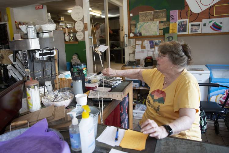 Elaine Hawthorne uses a pulley system to deliver an order slip to the kitchen at Cutting’s Northside Cafe in Hanover, N.H., on Tuesday, July 16, 2024. Owner Cole Cutting installed the line for his grandmother as she became less mobile and it was more difficult for her to walk orders across the restaurant. (Valley News - Alex Driehaus) Copyright Valley News. May not be reprinted or used online without permission. Send requests to permission@vnews.com. Valley News photographs — Alex Driehaus