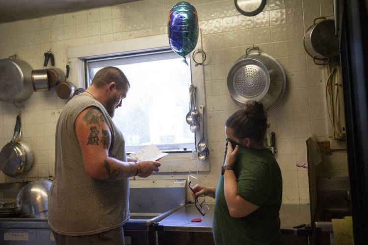 Cole, left, and Tara Cutting tear up after reading a card from the staff at Lyme Road Dental at Cutting’s Northside Cafe in Hanover, N.H., on Tuesday, July 16, 2024. The Cuttings are closing their restaurant on July 17, but plan to continue catering at least through October. “It’s been an emotional couple weeks here,” Cole Cutting said. (Valley News - Alex Driehaus) Copyright Valley News. May not be reprinted or used online without permission. Send requests to permission@vnews.com. Valley News — Alex Driehaus