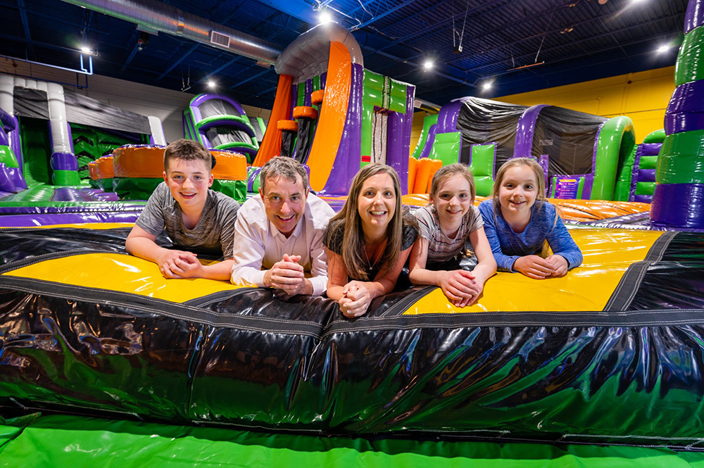 Xtreme Craze Owner Greg Hughes, second from left, and his family in the inflatable park. Courtesy photo.