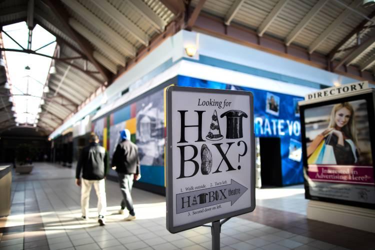A sign inside the Steeplegate Mall directs people looking for the Hatbox Theatre to go outside and turn left on Monday, February 14, 2022. Credit: GEOFF FORESTER