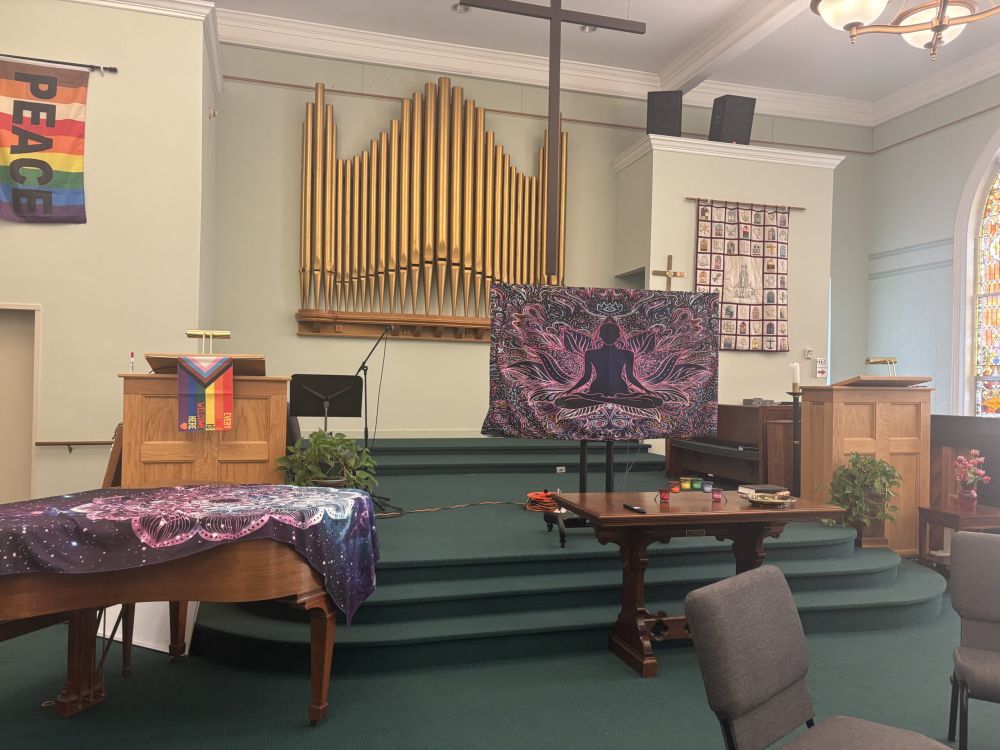 The chamber of the First Congregational Church now hosts sound baths and yoga sessions while construction awaits. (Photo by Maya Mitchell/ New Hampshire Bulletin)