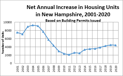 New Hampshire added 4,446 units to its housing supply in 2020, slightly less than in 2019 when housing stock increased by 4,483. This drop of 37 units, while small, is the first year since 2013 that the total number of new housing units permitted by towns and cities in the state decreased. Total building activity at the beginning of this decade is less than half of the peak level in the early 2000s.
