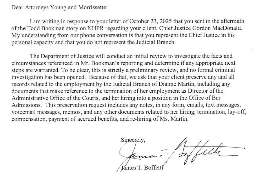 Letter sent by the NH Department of Justice to Chief Justice MacDonald, via his attorney The letter send by the New Hampshire Department of Justice to the attorney representing Chief Justice Gordon MacDonald, dated Oct. 27, 2025