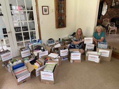 NH Reps. Nancy Murphy, left, and Rosemarie Rung, both of Merrimack, sort out donated back-to-school items in Rung's family room on Tuesday. Rung presides over a yearly donation drive for school supplies. (Courtesy photo)
