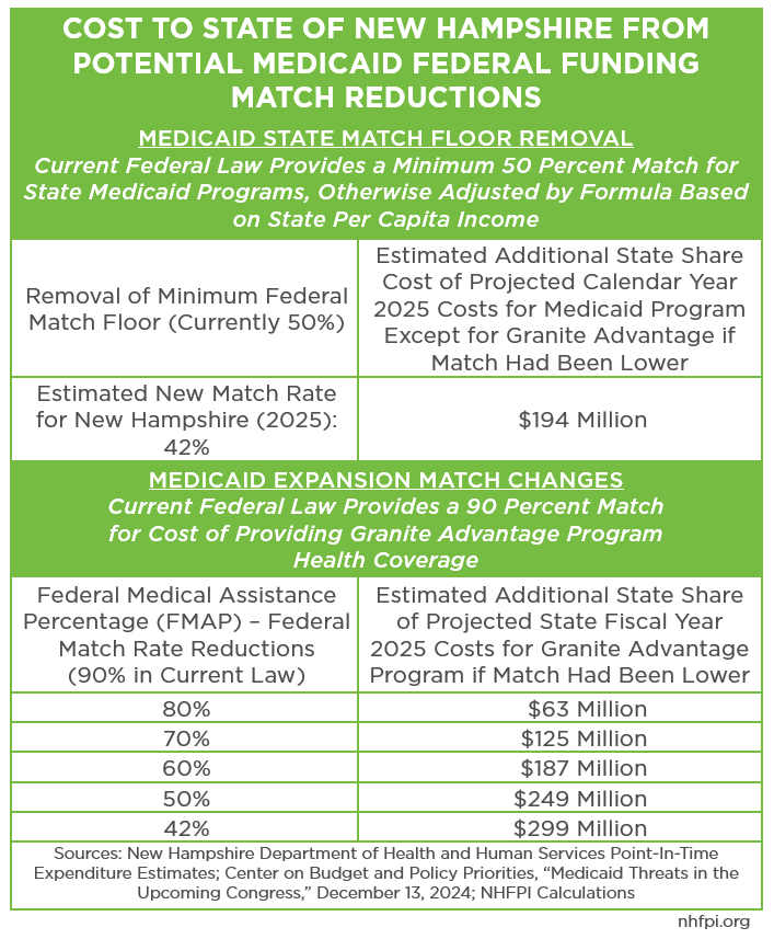 One of several proposed changes is lowering or eliminating the FMAP floor set at the 50 percent match for states. If this floor were eliminated, New Hampshire’s reduced FMAP would have likely resulted in an additional cost to the State of $194 million in State Fiscal Year 2025 for all parts of the Medicaid program outside of Medicaid Expansion; this figure is based on point-in-time expenditure projections from the New Hampshire Department of Health and Human Services and a December 2024 analysis from the Center on Budget and Policy Priorities that estimated a 42 percent FMAP for New Hampshire without a 50-50 match floor and a resulting 17 percent increase in non-federal share costs.