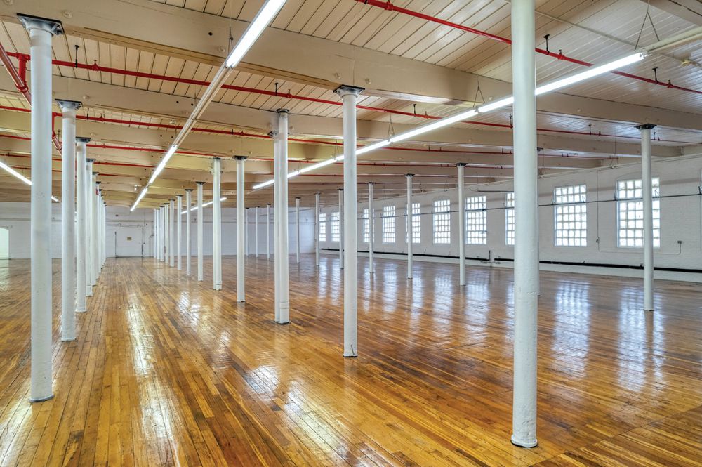 Original support columns and wood floors at Newport Mill. Inset: Newport Mill exterior (Courtesy photo)