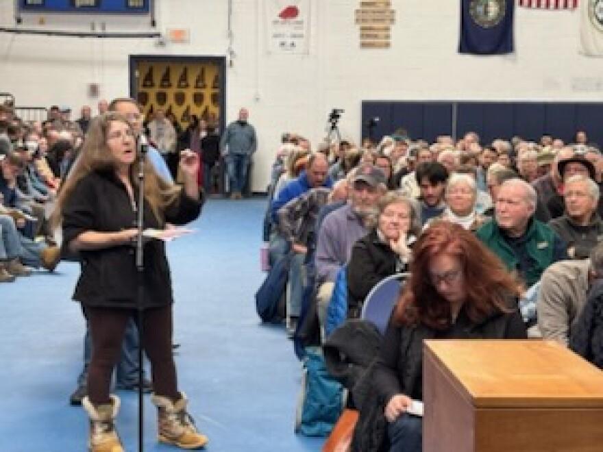 Bambi Davis of Newbury backed capping school spending at $27,000 a student at last year's Kearsarge Regional School District deliberative session. It failed, 1,435 to 113. (Annmarie Timmins/NHPR)