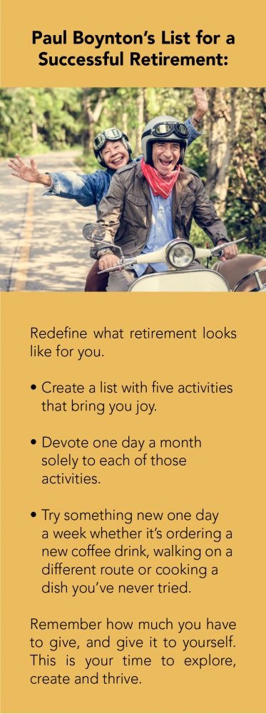 Retirement can go beyond those items listed on the RCS. As the author of “Begin With Yes: A Short Conversation That Will Change Your Life Forever,” Boynton has helped millions of his followers and readers say yes to life. To that end, retirement is the perfect time to do the things you’ve always wanted to do but never pursued. He suggests taking simple, actionable steps to pursuing something different.