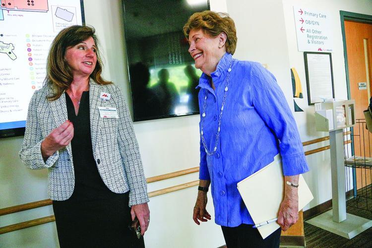 U.S. Sen. Jeanne Shaheen (right) talks with Hospital President Tricia Costigan near the main entrance before a tour during a visit to MaineHealth Memorial Hospital in North Conway on Aug. 12. (RACHEL SHARPLES PHOTO)