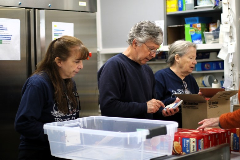 Apryl Blood (L), Charlie Betz (M) and Rose Finegan sort through an early morning delivery of frozen meat for the Warner Food Pantry. (Credit: ALEXANDER RAPP / Monitor)