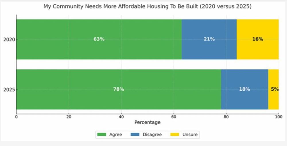 In “key findings” from the 2025 survey released Wednesday, 78% agreed with the statement “My community needs more affordable housing to be built,” compared to 63% in 2020. The number of those who disagreed was close – 18% in 2025 and 21% in 2020 – but those who weren’t sure dropped from 16% in 2020 to 5% this year.