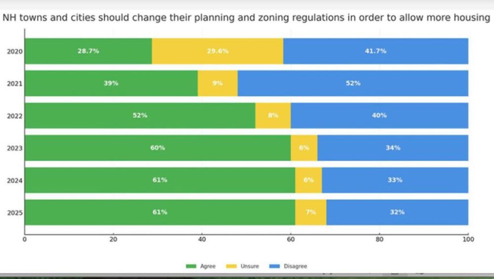 - NH towns and cities should change their planning and zoning regulations in order to allow more housing: 61% agree, 32% disagree, 7% aren’t sure.