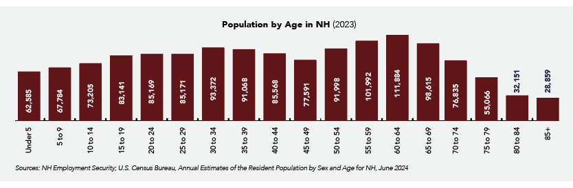 It’s well-known that NH’s population is old. The Granite State’s median age of 43.4 years old is tied with neighboring Vermont for the second-oldest in the country, according to 2023 Census data, and is well above the national median of 39.1 as of 2024. (Maine, with a median age of 44.8 years, has the oldest population.) Aging demographics are associated with several economic challenges, including increased healthcare costs and a strain on retirement systems like social security.
