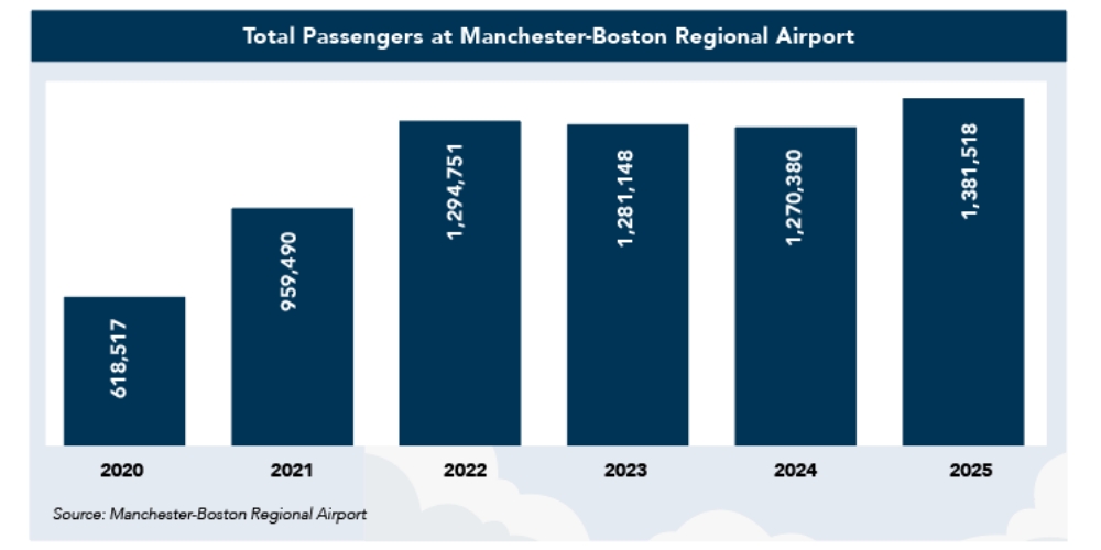 More than 1.38 million passengers flew in and out of Manchester-Boston Regional Airport in 2025, an almost 9% increase in passenger activity over 2024 and the best year since pre-pandemic 2019. The airport averaged 115,000 to 116,000 passengers per month according to a report released in February.