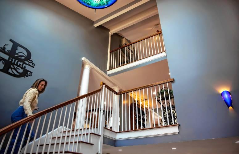Kristi Whitten, the CEO of the Whitten Team at Keller Williams Realty, walks up the three-story main staircase of the 5,600-square-foot house listed for $1.6 million on Mansion Road in Dunbarton. (Geoff Forester/Monitor staff)