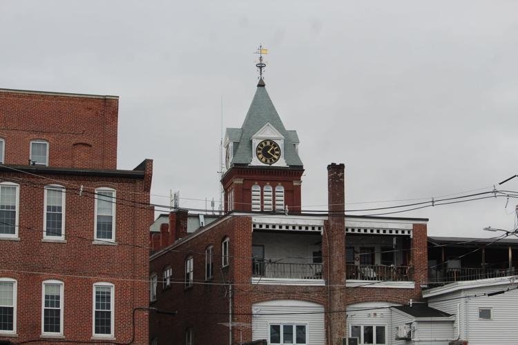 The Newport Opera House clocktower looms over an apartment building in downtown Newport, near the former home of the Argus-Champion. (Abigail Ham/Sentinel Staff)