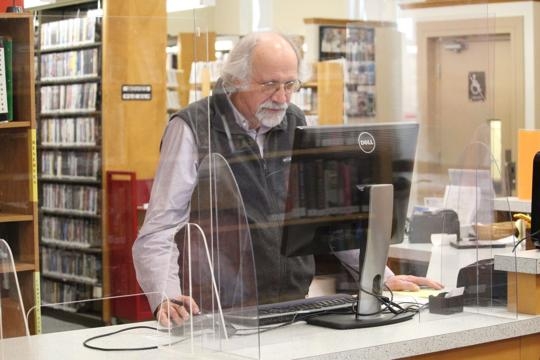 Circulation Librarian Colin Sanborn works at his desk Wednesday, April 1, at the Fiske Free Library on Broad Street in Claremont. The library has archives with hundreds of years of local newspapers. (Abigail Ham/Sentinel staff)